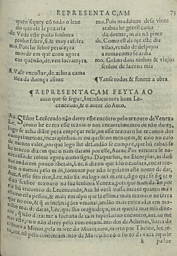 Primeira parte dos avtos e comedias portvgvesas feitas por Antonio Prestes, & por Luis de Camões, & por outros Autores Portugueses, cujos nomes vão nos principios de suas obras. Agora nouamente juntas & emendadas nesta primeira impressão, por Afonso Lopez, moço da Capella de sua Magestade, & a sua custa. Por Andres Lobato Impressor de Liuros, Anno 1587, fol. 73r.