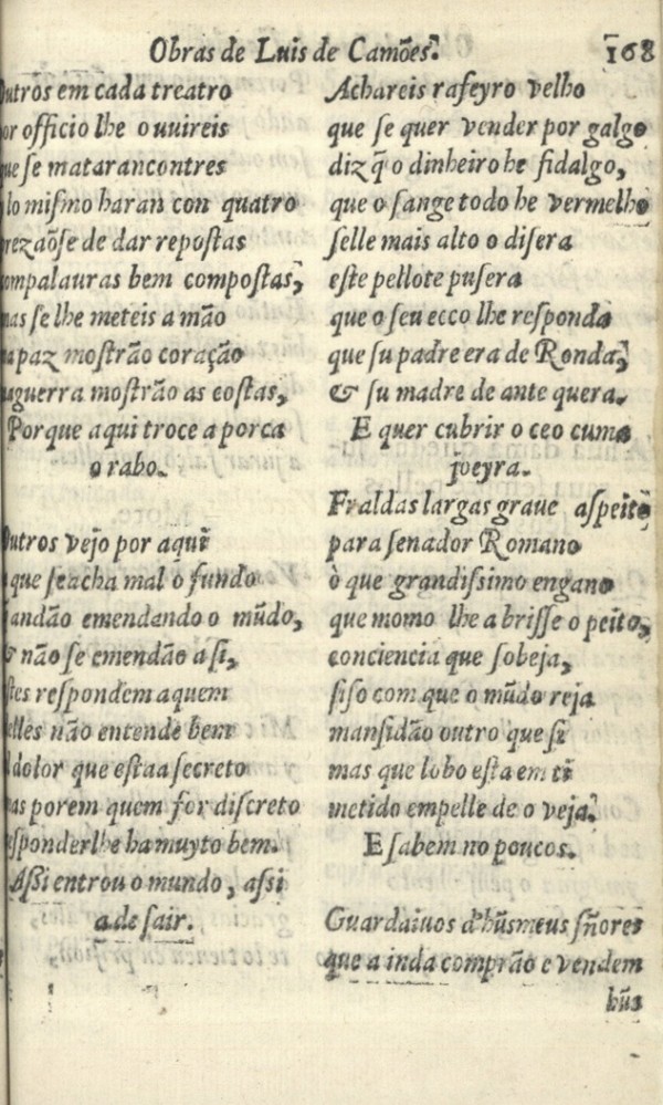 Outros em cada treatro | por oƒƒicio lhe ouuireis | que ʃe mataran con tres | y lo miʃmo haran con quatro | prezaõʃe de dar repoſtas | com palauras bem compoſtas, | mas ʃe lhe meteis a mão | na paz moſtrão coração | na guerra moſtrão as coſtas, | Porque aqui troce a porca o rabo.