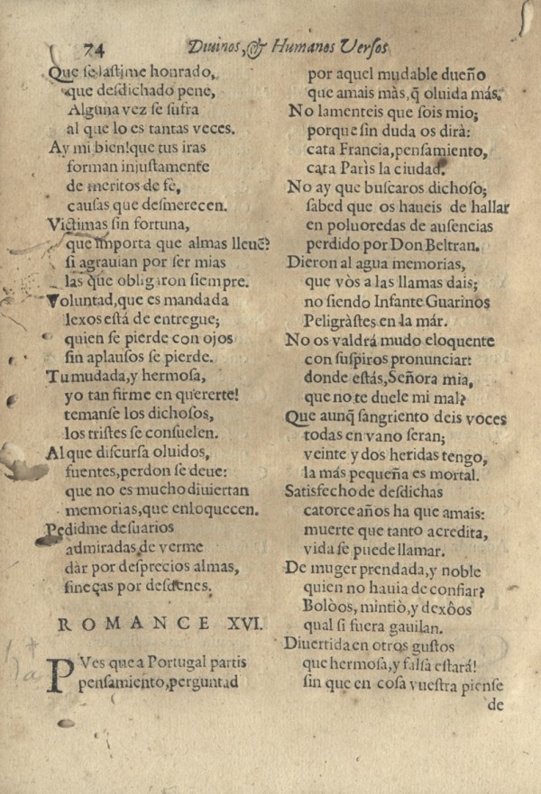 Satisfecho de deſdichas | catorce años ha que amais: | muerte que tanto acredita, | vida ſe puede llamar. | De muger prendada, y noble | quien no hauia de confiar? | Bolòos, mintiò, y dexôos | qual ſi fuera gauilan.