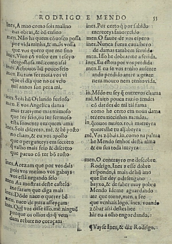 Primeira parte dos avtos e comedias portvgvesas feitas por Antonio Prestes, & por Luis de Camões, & por outros Autores Portugueses, cujos nomes vão nos principios de suas obras. Agora nouamente juntas & emendadas nesta primeira impressão, por Afonso Lopez, moço da Capella de sua Magestade, & a sua custa. Por Andres Lobato Impressor de Liuros, Anno 1587, fol. 55r.
