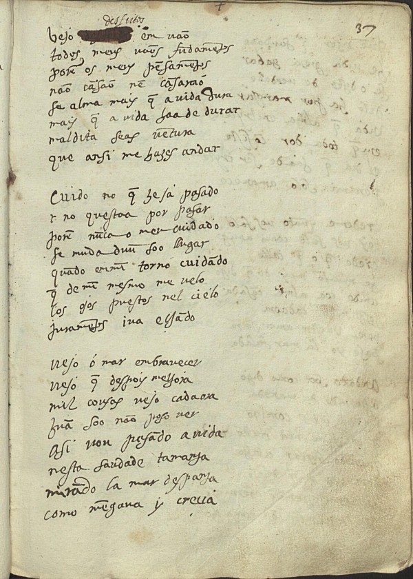 Vejo desfeitos em vão | todos meus vãos fundamentos | porque os meus pensamentos | não cansam nem cansarão. | Se alma mais qu'a vida dura, | mais qu'a vida há de durar: | maldita seas, ventura | que ansí me hazes andar. |
