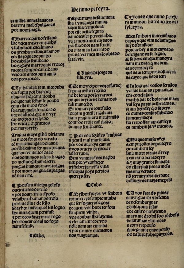 CG1557: Cancionero general: qve contiene mvchas obras de diuersos autores antiguos, con algunas cosas nueuas de modernos, de nueuo corregido y impresso. En Anvers, En casa de Martin Nucio, à la enseña de las dos Cigueñas. 1557. Con Priuilegio del Rey, fol. cccxcjv.
