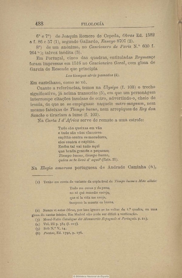 Aqui comiençã dos maneras de glosas nueuas: y esta primera es đl romãçe que dize. Tiẽpo bueno tiẽpo bueno: y otra đ acordaos de quien se oluida y las coplas de quiẽ os aparto de mí: cõ otras coplas y villancicos y motes con sus glosas (Pedro M. Cátedra, Seis pliegos poéticos góticos desconocidos, c. 1540, Madrid, El Crotalón, 1983, n.º 5).