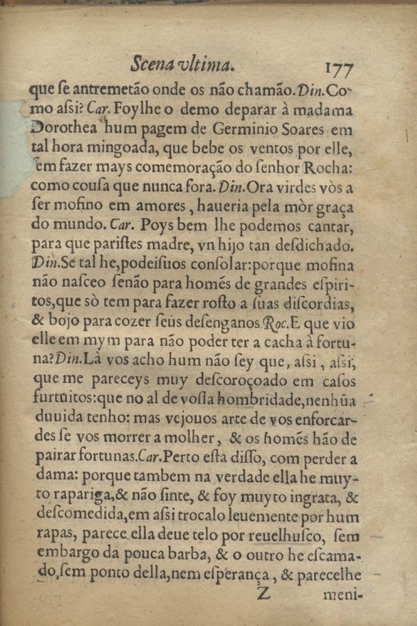 Car. Foylhe o demo deparar à madama Dorothea hum pagem de Germinio Soares em tal hora mingoada, que bebe os ventos por elle, ſem fazer mays comemoração do ſenhor Rocha: como couſa que nunca fora. Din. Ora virdes vòs a ſer mofino em amores, haueria pela mòr graça do mundo. Car. Poys bem lhe podemos cantar, para que pariſtes madre, vn hijo tan deſdichado.