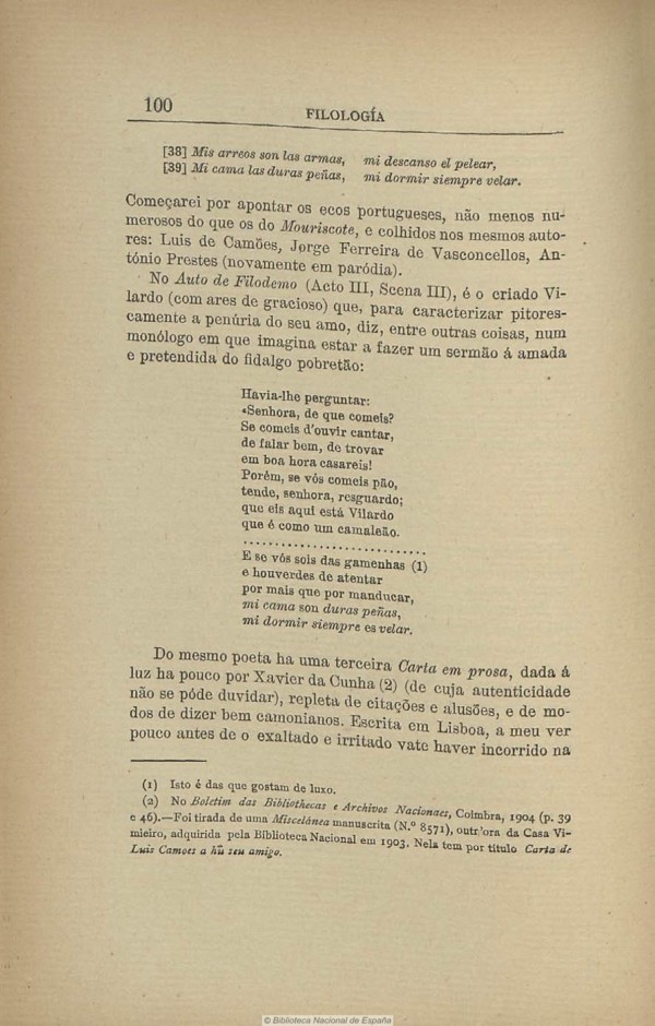 [Moço] E se vós sois das gamenhas | e houverdes d'atentar | por mais que por manducar: | mi cama son duras peñas | mi dormir siempre velar. | A viola senhor vem | sem primas nem derradeiras | mas sabe que lhe convém? | Se quer senhor tanger bem | há de haver mester terceiras.