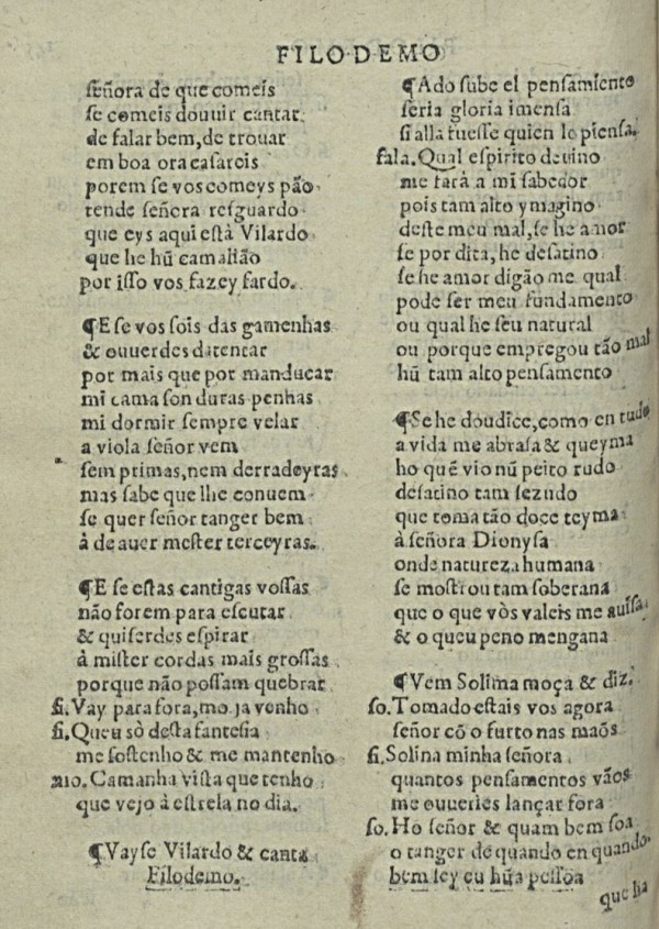 [Moço] ¶ E ſe vos ſois das gamenhas | & ouuerdes datentar | por mais que por manducar | mi cama ſon duras penhas | mi dormir ſempre velar | a viola ſeñor vem | ſem primas, nem derradeyras | mas ſabe que lhe conuem | ſe quer señor tanger bem | à de auer meſter terceyras